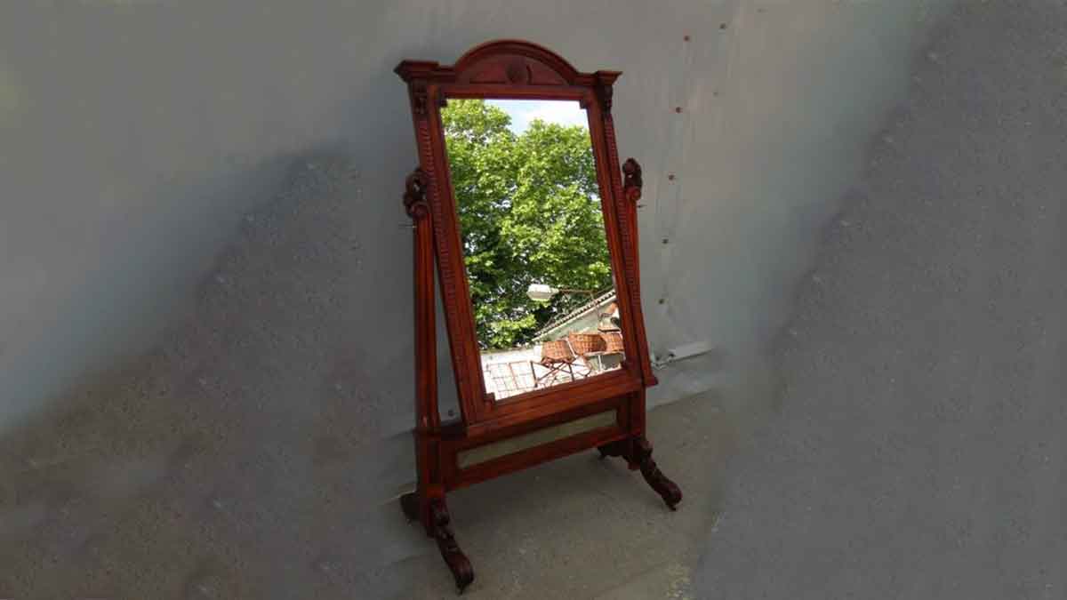 Az antik-kereskedés viszonylag közel volt, a hétköznapi forgalomban is odaértek cirka negyed óra alatt. Beléptek. A hatalmas terem tele volt sokat megélt, régi bútordarabokkal. Őket egy nagyméretű, neobarokk állótükör várta. Kerete szépen mívelt, tükre fózolt, bal felső sarkán a korából adódóan kissé homályos folttal. Szép darab, a homályos foltocska pedig nemhogy csúfította volna, inkább kedves bájt kölcsönzött külsejének. Embereink kissé nehézkesen emelték fel, tömör fa keretének köszönhetően tetemes súllyal rendelkezett. Miután tudatosult bennük, hogy a szállítási cím csak néhány utcácskával arrébb van, úgy döntöttek gyalog cipelik el új tulajdonosához a tükröt. Megfogták, és komótosan battyogva nyakukba vették a poros, napsütötte utcákat. Mire a közeli Főtérre értek, elfáradtak, és meg is szomjaztak. Betértek hát egy sarki kocsmába, hogy leöblítsék kiszáradt torkukat. A tükröt pedig a kirakat elé helyezték, hogy jól ráláthassanak.