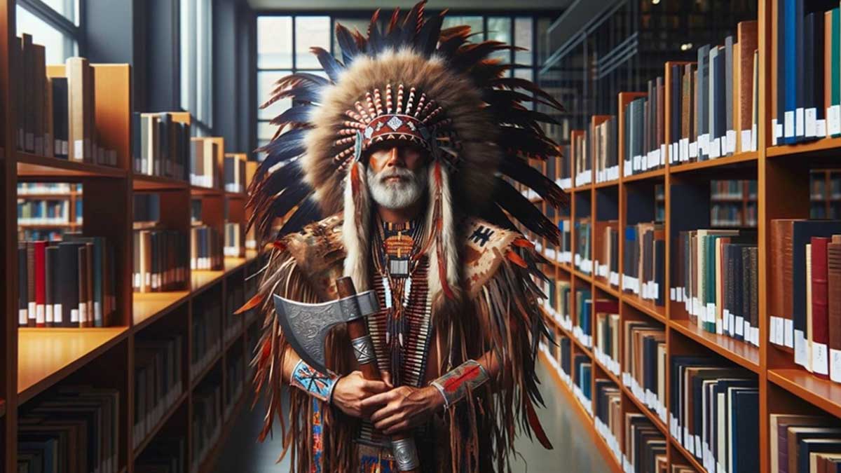 Egy indián törzsfőnök állt ott teljes harci díszben fején tolldísz, kezében harci bárdot tartott.