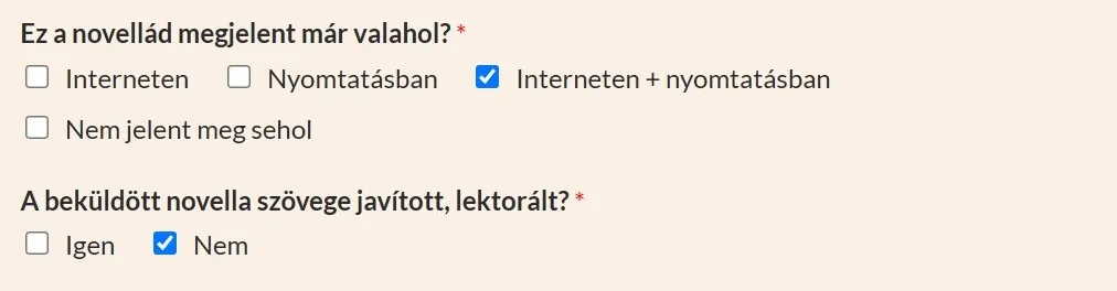 - A beküldés során van egy kérdés, miszerint a novella megjelent-e már, és a szövege javított-e.