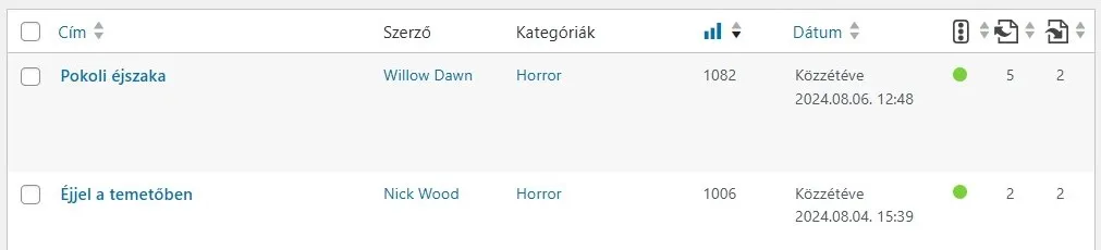 - Ezen felül, minden megjelent novella bekerül a google indexébe, így az a keresések alkalmával minden esetben megjelenik a releváns találatok között. Ahhoz, hogy ez ténylegesen megvalósuljon, a kért adatok megadása alapfeltétel, amivel minden novella úgy lesz készen, hogy a google-nak megfeleljen. A zöld pötty azt jelzi, hogy a novella megfelel a google elvárásainak.
